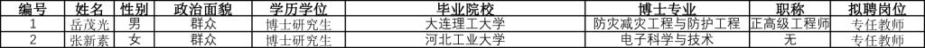 根据《事业单位公开招聘人员暂行规定》(人事部第6号令)、《防灾科技学院公开招聘人员暂行办法》(防科发人〔2018〕119 号)、《防灾科技学院2021年度事业单位公开招聘公告》(2021年4月21日发布),经考核,拟聘用岳茂光等2人为防灾科技学院工作人员,现予以公示。